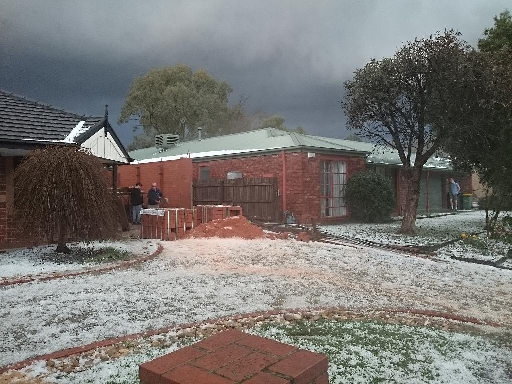This was two bouts of hail in 20 minutes in Rowville (Eastern Melbourne suburb in foothills of Dandenongs) at about 5.45pm. If you didn't know you could say it was snow. Chris is standing outside my place with the green Colorbond roof. Most of the hail is still sitting there un-melted as at 8.00pm.