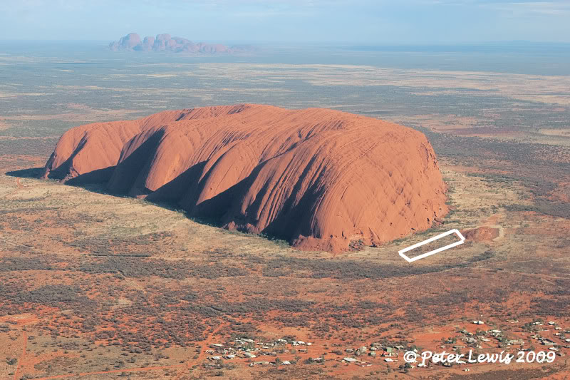 I can't see the attraction in climbing the rock. Looked like bloody hard work and was closed due to temperatures exceeding 36 degrees anyway. Interestingly the Aborigines at the new cultural centre request that you don't climb it but say if you do, you need to follow the trail of their ancestors which I believe is where the chain is anyway. Obviously there's been a few deaths on the rock as there are a number of plaques about 20m up the rock near the climb point (which you can't read from the ground) dedicated to those that have lost their lives. I found it more interesting from the chopper as you can still see the original Connellan strip. Photo not mine.